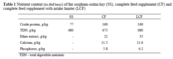 When free choice supplements are offered to forage-fed goats, a substitution of supplement for forage is often observed. Huston (1994) reported a decrease of 22% in forage intake when goats were supplemented at 30% of their digestible energy requirement, as compared with unsupplemented goats. Osuji & Odenyo (1997) reported a decrease of 10% in forage intake when goats were supplemented at 1.5% of bodyweight with lablab legume hay. A self-limiting supplement, such as LCF, could provide a means to reduce the substitution effect observed with free-choice supplements