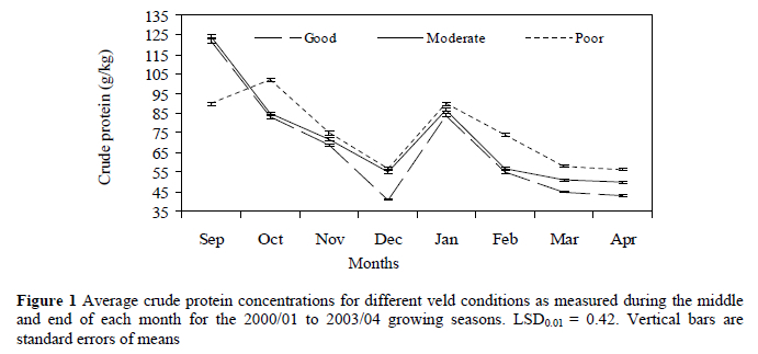 The highest CP levels occurred in middle September, where it formed an average (± s.e.) of 126.6 ± 31.2 g/kg and 128.1 ± 33.6 g/kg of the DM for grasslands in good and moderate condition, respectively (Figure 1). The grasslands in poor condition had the highest (P < 0.01) monthly CP concentrations during the growing season except for the beginning of the growing season (September and the beginning of October). The lower CP content found in plant material as grassland condition improved, was possibly caused by its mobilization (growth reserves) for high DM production per unit area delivered.