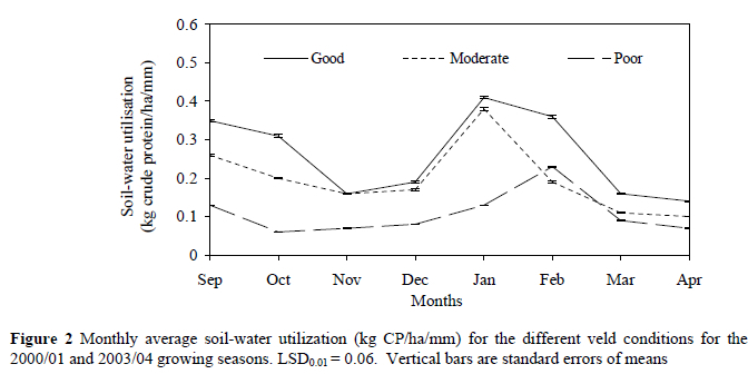 It is clear that grassland in good condition does not only deliver a higher DM production than degraded veld, but also has a significantly higher total CP content and better soil-water utilization than grassland in poor condition. Soil-water utilization (expressed in kg CP for each mm of evapotranspiration) is a convenient and suitable tool to evaluate the productivity of a grassland ecosystem. Fodder flow planning and veld risk management for livestock production are more complicated in grassland in poor condition due to lower production and soil-water utilization efficiency. The efficiency and risk with which rainfall is converted into plant production by fodder plants and eventually gross farming income from the basis of sustainability of extensive ruminant production on a grassland ecosystem.