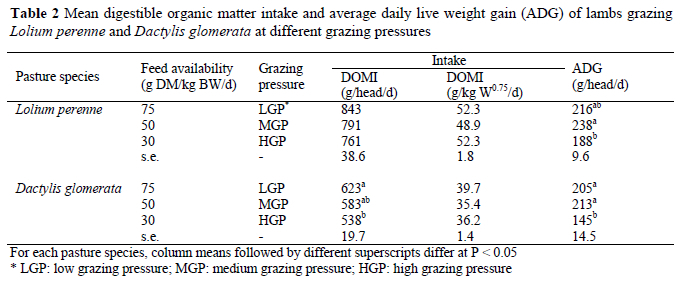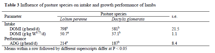 In the present study intake and growth rate of lambs differed significantly between pasture species. The DOMI (g/head/day), DOMI (g/kg W0.75/day) and ADG (g/head/day) of the lambs were higher for lambs on L. perenne than those on the D. glomerata pasture (Table 3). All other things being equal, intake of sheep is at its highest when pastures are tall, leafy and dense relative to the animal's bite characteristics (Hodgson & Illius, 1996). The lower NDF concentration of grass selected by the lambs on L. perenne corresponded well with their higher intake and growth rates compared to the lambs grazing the D. glomerata pasture (Van Niekerk et al., 2006). Noteworthy, the ADG recorded for lambs on L. perenne (214 g/head/d) during spring was higher than all ADG values reported for lambs grazing a P. maximum (80-140 g/head/d) pasture at different stocking rates (Relling et al., 2001).