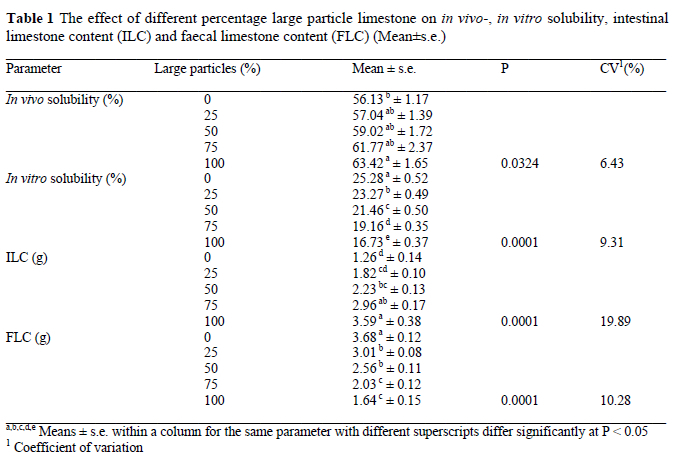 Rao & Roland (1989) illustrated that the in vivo solubility of large particle limestone (2.0 - 5.0 mm) was significantly higher than the solubility of small particles (0.5 - 0.8 mm) limestone. Various other authors (Rao & Roland, 1990; Guinotte & Nys, 1991; Zhang & Coon, 1997) also reported that large (2.36 - 5.0 mm) compared to small (0.075 - 0.8 mm) particle size limestone resulted in a higher in vivo solubility. In the present study, the increased in vivo solubility observed with increased percentage of large particles could be ascribed to the prolonged retention time of larger particle limestone in the gizzard (Rao & Roland, 1990; Zhang & Coon, 1997). A longer retention time in the acidic conditions of the gizzard would ensure that more CaCO3 dissipates into Ca2+ resulting in a higher in vivo solubility (Zhang & Coon, 1997; Jacob et al., 2003). In agreement to these findings, Hendrix-Genetics (2006) indicated that the bio-availability of Ca2+ at the end of the dark period is improved by using a larger particle size Ca source with a low in vitro solubility.