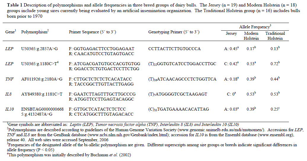 Genetic polymorphisms were identified in the LEP, TNF, IL8 and IL10 genes, and significant differences in allele frequencies were observed among the three groups of dairy sires. The three populations studied were chosen because they represented differences in selection emphasis placed on production traits. Thus, the observed differences in allele frequency may suggest that the genomic regions studied are associated with the differing selection goals. Differences in the LEP and IL10 allele frequencies between modern and traditional Holstein are of particular interest because they may reflect the intense selection pressure for increased milk and production traits that has occurred in the Holstein breed since the 1970's. This LEP SNP has previously been associated with milk and protein yield in dairy populations (Buchanan et al., 2003), and results from the current study make IL10 a particularly interesting candidate gene for future investigations. Nevertheless, it should be recognized that the observed differences in allele frequencies may also result from random genetic drift or sampling bias.