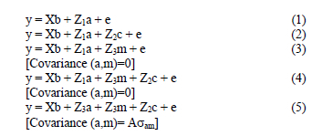 In these analyses, y was a vector of observations for untransformed FEC, cube root transformed FEC or log transformed FEC, and b, a, m and c vectors of fixed effects, direct genetic variances, maternal genetic variances and maternal permanent environmental variances respectively. X, Z1, Z2 and Z3 were the corresponding incidence matrices relating the respective effects to y, while e was the vector of residuals. A was the numerator relationship matrix, and σam the covariance between direct genetic and maternal genetic effects.