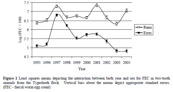 The type of transformation that was applied resulted in minimal changes in conclusions derived from the data as pertaining to the fixed effects analysed. Only the results obtained from the analysis involving log transformed FEC will thus be presented. Fixed effects that influenced the data significantly were sex, birth year the sex x birth year interaction (all P < 0.01) as well as birth type (P < 0.05). The effect of selection line approached significance (P = 0.06), while FEC was independent of dam age. In general, ewes excreted fewer worm eggs in their faeces than rams (Figure 1). However, the magnitude of the difference between rams and ewes differed between years, resulting in the observed interaction. During the earliest (1995 and 1996) and the most recent production years (2003 and 2005) the differences in FEC between ewes and rams were particularly large.