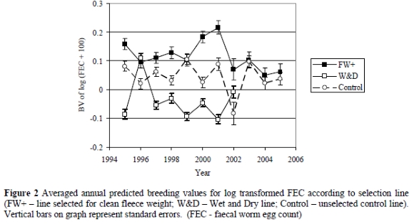 Direct breeding values for log transformed FEC were obtained from the single-trait analysis with the best log likelihood, and averaged for the respective selection lines within birth years. Genetic trends derived in this way were inspected for differences between lines, using standard errors of the means to inspect line differences within birth years for significance. These breeding values were obtained from an analysis where selection line and its interactions with other traits were excluded from the operational model.