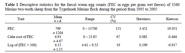 Descriptive statistics for untransformed FEC indicated extreme variation and a non-normal distribution (Table 1). The properties of the data were markedly improved by the transformations applied, which validate the usage of these transformations. The log transformation improved the extreme variance in particular, resulting in a coefficient of variation of below 20%.