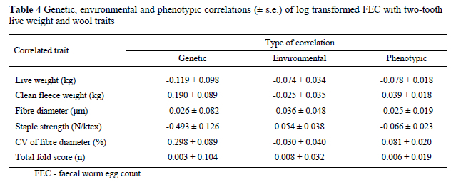 The genetic correlation of FEC with CV of fibre diameter was positive (i.e. favourable) in the present study. Three comparable estimates reported by Greeff & Karlsson (1998; 1999) ranged from -0.05 to 0.10. Two of these estimates were in the same direction as the correlation reported in Table 4, but smaller in magnitude. The genetic correlation of FEC with total fold score was negligible. No comparable results were found in the literature.