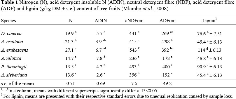 The chemical analyses described below were carried out as part of an earlier study on the chemical composition and in vitro fermentation of tree fruits (Mlambo et al., 2008) and are summarised here for ease of reference in Tables 1 and 2 in order to describe the fruit materials used in this study. Chemical analyses data summarised in the two tables were used in their raw form for correlation analyses with in vitro tannin bioactivity reported in this paper.