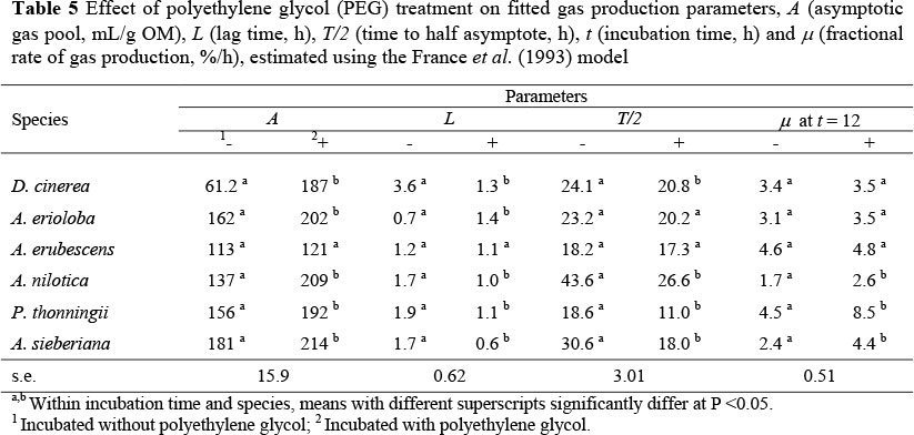 A comparison of gas release kinetics from these fruits shows that D. cinerea gave the highest response to PEG. Table 5 presents the effect of PEG treatment on gas production parameters which have been fitted using the France model (France et al., 1993). Tannin inactivation through PEG increased (P <0.05) the asymptotic gas pool (A) in all tree fruits except for A. erubescens fruits. Polyethylene glycol treatment significantly reduced time to half asymptote (T/2) for all samples except for A. erubescens and A. erioloba fruits. Fractional rate of gas production (µ, %/h) at 12 h post-inoculation was increased due to PEG treatment for A. sieberiana, P. thonningii and A. nilotica. Polyethylene glycol treatment reduced the length of the lag phase in fruits from D. cinerea, A. nilotica, P. thonningii and A. sieberiana. Surprisingly, an increased lag phase was observed in A. erioloba fruit.