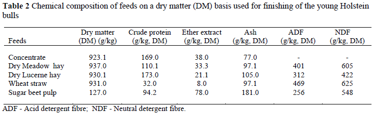 The study was carried out at the Eastern Anatolian Agricultural Research Institute, Erzurum, Turkey. Fifteen Holstein Friesian bulls (18 months old) were divided into three groups of five animals of similar body weights. The bulls were housed in a tethered stall barn containing individual pens furnished with feeders and automatic drinkers. All groups were offered a diet containing 60% concentrate and 40% roughage (as fed basis). The roughage consisted of a mixture of dry meadow hay including mixture of grasses, dry lucerne, wheat straw, and wet SBP. The concentrate was made up of barley, maize, wheat, wheat bran, cotton seed meal, sunflower seed meal and salt. The first group (control group = C) received a mixture of dry meadow hay, dry lucerne and wheat straw as roughage. The second and third treatment groups were fed a mixture of roughage in which SBP at levels of 4% and 8% on dry matter (DM) basis, respectively, partially substituted wheat straw in the diet (Table 1). Hence, there were three experimental groups (C; 4% SBP, 8% SBP) in the study. The animals were fed individually and were adapted to the finishing diets over a period of two weeks. All bulls had ad libitum access to the concentrate and roughage mixture during the whole finishing period. The DM (AOAC, 1990; method 934.01), crude protein as Kjeldahl nitrogen (AOAC, 1995; method 990.03), ether extract (AOAC, 1990; method 920.39), ash (AOAC, 1990; method 9420.5) and acid detergent fibre (ADF) and neutral detergent fibre (NDF) (Tyznik, 1992) levels in the diet were determined (Table 2).