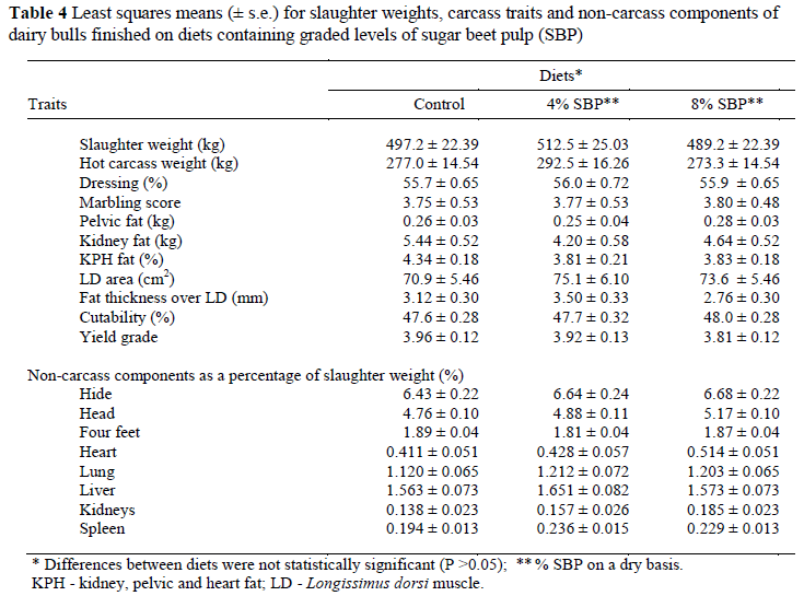 Increasing the proportion of SBP in the diets of the dairy bulls by substituting wheat straw did not affect slaughter weight, carcass characteristics or proportions of non-carcass components significantly (P >0.05, Table 4). Yield grade and cutability values were also not adversely affected by the inclusion of SBP in the diets. Similar effects of SBP in finishing rations of beef bulls were reported by Marsh et al. (2001) and Cuvalier et al. (2006). Park et al. (2001) observed that hot carcass weights, LD areas, yield grade and cutability values of beef steers in the control, 8.5% SBP, and 12.5% SBP groups did not differ significantly. There were also insignificant differences in fat thickness over the LD, marbling score and percentage of the kidney, heart and pelvic fat (KPH %) as a result of an increased level of beet pulp in the diets of beef cattle (Bauer et al., 2007). In the present study marbling scores were also not affected by dietary treatment (Table 4).