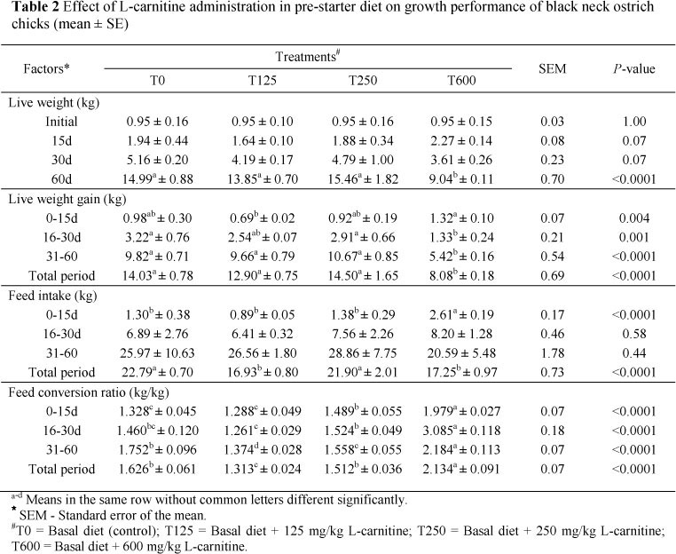 The objective was to determine the growth responses of Black Neck ostrich chicks to different dietary levels of L-carnitine in pre-starter diets. Thirty-two day-old ostrich chicks were randomly divided into four treatments with four replicates, each containing two chicks. All birds received the same basal diet supplemented with 0 (T0, control), 125 (T125), 250 (T250) or 600 (T600) mg L-carnitine per kg. Responses were monitored over three growth phases, 0 - 15, 16 - 30 and 31 - 60 days, the total period being 60 days. T600 had the lowest live weight (LW) and live weight gain (LWG) over the 60-day treatment period. Live weight and LWG values of T125 and T250 did not differ from those of T0. T600 had the worst feed conversion ratio (FCR) during the different stages (0 - 15, 16 - 30 and 31 - 60 days) and over the total 60-day period. Feed intake (FI) was reduced significantly in the T125 and T600 treatments compared to T0 and T250 treatments over the total period. The treatment, T125, showed the lowest FI and FCR responses over the total period, whereas there was no difference between T0 and T250. The results suggest that supplementing the pre-starter diet with 125 mg/kg of L-carnitine can improve the performance of ostrich chicks by decreasing the FCR. In contrast, the suppressive effect of a high inclusion level (T600) might indicate that ostrich chicks are sensitive to a high level of inclusion that could cause adverse effects.