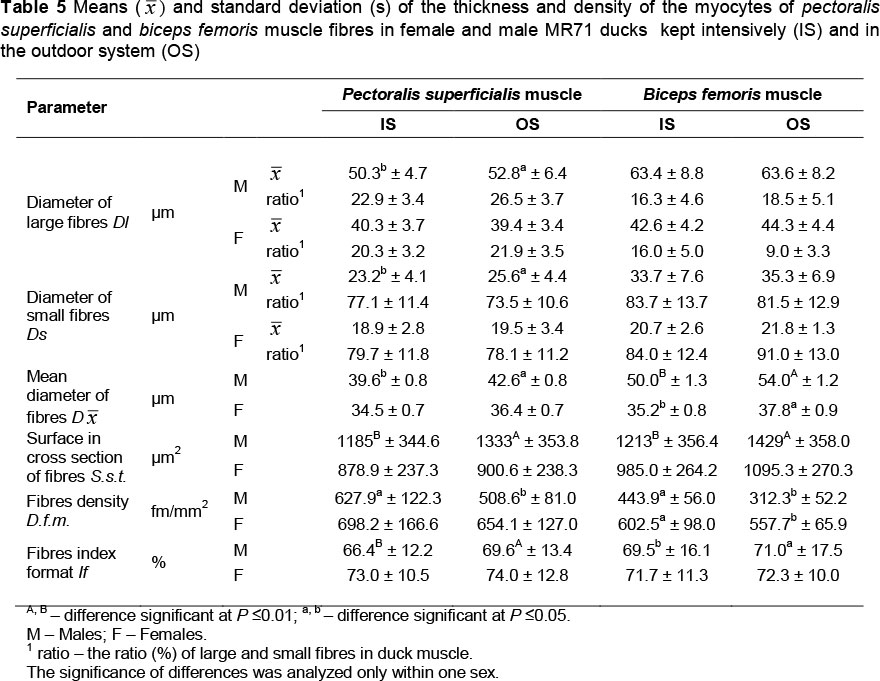 Determination of diameter (µm) and cross-section area (µm2) of muscle fibres enabled calculating their index. Muscle fibres of MR71 IS females were always thinner, and in the case of males these differences were confirmed significant (P <0.01) in both pectoralis superficialis and biceps femoris muscles (P <0.05). Thinner fibres were also demonstrated in pectoralis superficialis muscle of P44 IS ducks (P <0.05) and drakes (P <0.01), whereas differences were not confirmed in their biceps femoris muscles (Tables 5 and 7). Interestingly, it seems also that leg muscles were always more diversified in terms of the analysed traits of muscle fibres, compared to the more homogenous fibres of pectoralis superficialis muscles, which may be seen in usually greater standard deviations. According to Torrella et al. (1996), in wild ducks this is linked with functions for which particular groups of muscles are responsible. The pectoralis superficialis muscles are mainly linked with aviation and wing motion that are strongly limited in domesticated fowl. In turn, the leg muscles undergo strenuous effort during walking, moving up, sitting down or perching on tree branches in the case of Muscovy ducks. In our study, the differences in diameters of biceps femoris fibres could be even more attributable to the high body weight of the birds (Tables 3 and 4).
