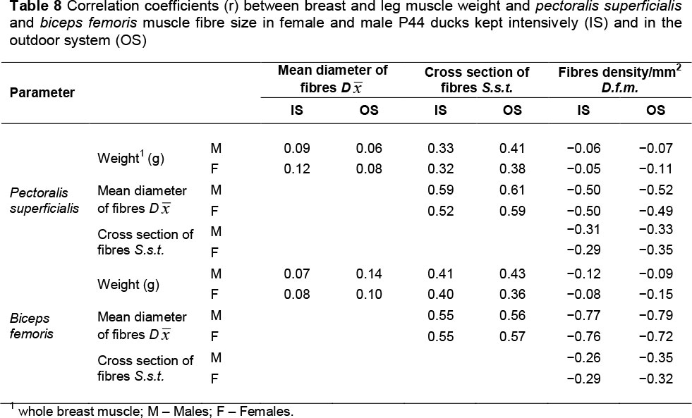 The analysed parameters of muscle fibre sizes were usually higher in IS groups, and an opposite tendency was observed in fibre density (fm/mm2) (Tables 5 and 7). In each case this parameter was negatively correlated with muscle weight as well as diameter and cross-section of muscle fibres (Tables 6 and 8). The highest negative correlations (from -0.72 to -0.98) were determined between fibre density and fibre cross-section area, which seems obvious. It does not, however, depict the total number of fibres in the muscle. This information may be another (a similar correlation was demonstrated by Teusan et al. (2011) who examined muscles of broiler chickens) confirmation that, regardless of the origin, sex or housing system of birds the number of fibres in muscles does not change or changes insignificantly, and that greater changes are observed in fibre size. No significant interactions were found between the housing system and sex of P44 ducks regarding muscle fibre traits. Both sexes were similarly responding to variable environmental conditions. Perhaps, it results from the lack of or very small sexual dimorphism in body weight and structure of muscles in the P44 ducks, similar to ducks originating from Anas platyrhynchos.