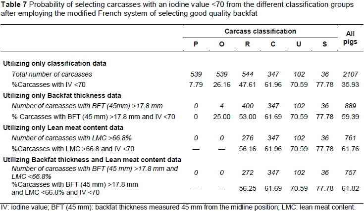 Simultaneous employment of the modified French system (BFT (45 mm) >17.8 mm and LMC <66.8%) as well as the maximum IV of 70 resulted in totally eliminating the P and O groups from having good fat quality (Table 7). As previously mentioned, the HGP utilizes both the BFT (45 mm) and LMC measurements in the classification process. Employing the modified French system in South Africa, therefore increases the probability of selecting pig carcasses with good fat quality (IV <70) from the R group from 47.6% (if the Intrascope is employed) to 56.3% (if the HGP is employed). If the modified French system is employed, the probability of selecting pigs from all classification groups with good fat quality (IV <70) using the Intrascope measured fat quality (utilizing only BFT measurements) is 35.9%. If the HGP is employed (utilizing BFT and LMC measurements) the probability of selecting pigs with good fat quality (IV <70) increases to 61.8%. The overall picture is therefore also improved.