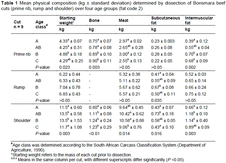 In Table 1 the mean weight (kg) of the physically dissected components (starting weight, bone, muscle, visible subcutaneous and intermuscular fat) from the three cuts of beef over the four age groups is presented.