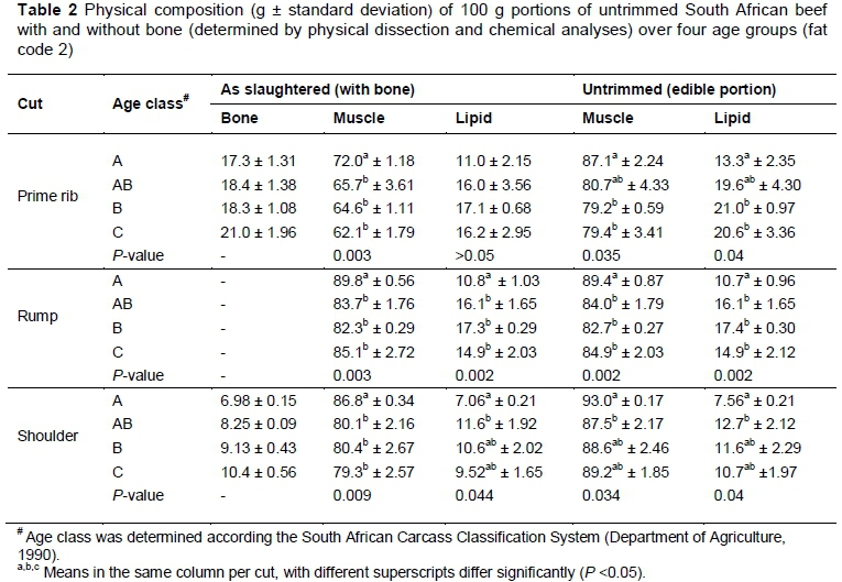 In 1981 untrimmed prime rib contained 61.5% muscle, 23.9% lipid and 14.1% bone (Department of Agriculture and Fisheries, 1981). In the current study, the percentage muscle was higher for marketable age A carcasses (72%), decreasing with age to 62.1% muscle in age C prime rib. Lipid content was notable less (ranging from 11% in age A to 17.1% in age B) in the current study (Table 2) compared to 23.9% fat recorded for marketable South African beef in 1981. For shoulder with bone, the contribution of muscle to the cut was between 79.3% (age C) and 86.8% (age A). This is a notable increase when compared to the average muscle content in 1981 of 77.8%. Lipid content was notably lower than the previously reported 14.2% in 1981 (Department of Agriculture and Fisheries, 1981), currently ranging from 7.1% (age A) to 11.6% (age AB). The previous contribution of shoulder bone to the cut was recorded as 7.2% (Department of Agriculture and Fisheries, 1981), in the current study the bone content was found to range between 7% (age A) and 21% (age C).
