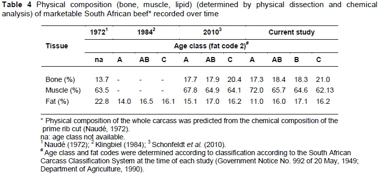In Table 4 the physical composition of South African beef as published over time is presented and compared to the results of the prime rib cut from the current study. In the 1990s the lipid content of marketable South African beef carcasses, fat code 2, was 19.8 g/100 g for age A-carcasses, 19.9 g/100 g for age AB-carcasses and 20.1 g/100 g for age C-carcasses (Schönfeldt et al., 2010). These values show a decrease in the lipid content of marketable beef from the 23% value obtained in the 1970s (Naudé, 1974). Results from the current study indicate a further decrease in lipid percentage of marketable age A beef to 11%, while the lipid percentage of age C carcasses has remained relatively constant at 16%.
