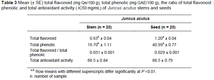 In the present study the total flavonoid and phenolic concentrations, total flavonoid : phenolic ratio and total antioxidant activity of the J acutus stems and seeds are shown in Table 3. Total phenolic concentration of the seeds was higher than that of the stems (P <0.01), though the concentrations of the stems and seeds were lower than those reported for Vicia fava L. (Baginsky et al., 2013), Onopordon acanthium L. seeds (Zare et al., 2014), Trigonella foenum graecum seeds (Seasotiya et al., 2014) and Albizia lebbeck and Cicer arietinum seeds (Imran et al., 2014). Total phenolic concentrations of J. acutus seeds and stems were higher than those reported for some varieties of potatoes (Solanum tuberosum L.) (Hesam et al., 2012). The phenol concentration of plants depends on intrinsic and extrinsic factors (Fratianni et al., 2007).