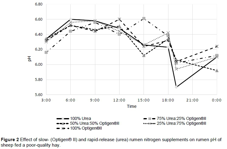 There were no differences among treatments in terms of average rumen pH (P <0.05). In the current study there were no definite tendencies that indicated 100% Optigen® II or a combination of Optigen® II/ urea had lower pH levels than 100% urea alone. The average pH over 24 hours was similar among treatments. Differences in pH were observed between Treatments 1 and 2 at 06:00 and between Treatment 1 and Treatments 2, 3 and 5 at 21:00 (P <0.05) (Figure 2). Taylor-Edwards et al. (2009b) found similar results in terms of pH between urea and SRU treatments. In contrast, Wahrmund et al. (2007), reported that rumen pH tended to be affected by urea source, where Optigen® II tended to have a lower pH than the control and urea treatments. The pH of all treatments was never below 6.0 for a prolonged period which would have had a negative influence on fibre digestion (Mould et al., 1983).
