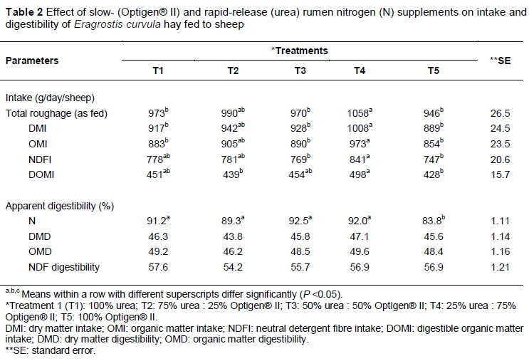 No differences were observed between the 100% urea and 100% Optigen® II treatments for intake (Table 2). A combination of urea and Optigen® II (Treatment 4) improved most of the intake variables (P <0.05), because higher DMI, organic matter intake (OMI) and total roughage intake were recorded for Treatment 4 compared with Treatments 1, 3 and 5 (P <0.05). The NDF and digestible organic matter intake (DOMI) of Treatment 4 were higher than in Treatment 5 (P <0.05). The higher intake observed with Treatment 4 could be owing to improved fermentation associated with better synchrony of N release from Optigen® II with the slow-released fermentable energy from fibre, as well as the fast N release from urea at early stages that synchronized with the fast fermentable energy from starch. A similar finding was reported by Ribeiro et al. (2011), who suggested that Optigen® II treatments might have provided sufficient N for rumen fermentation over an extended period. In contrast with this study and that of Ribeiro et al. (2011), Wahrmund et al. (2007) found no difference in DMI between the control, urea and Optigen® II treatments in a study that compared Optigen® II as a NPN source instead of urea in Bahia grass-fed animals.