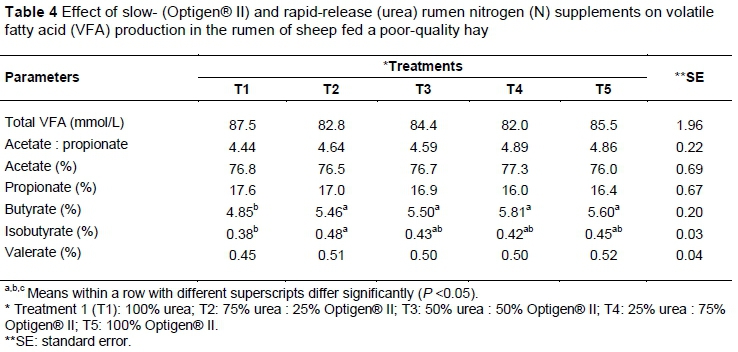 No differences (P >0.05) were observed among treatments for the ruminal acetate : propionate ratio and the other individual rumen-produced VFA, except for butyrate and isobutyrate (Table 4). In accordance with previous studies (Taylor-Edwards et al., 2009b), VFA concentration was not affected differently by urea and/or a slow-release N source. It is uncertain what caused the difference (P <0.05) in butyrate concentrations. According to Heldt et al. (1999) and Olson et al. (1999), supplemental energy is responsible for increased butyrate concentration in the rumen, and not the RDP source.