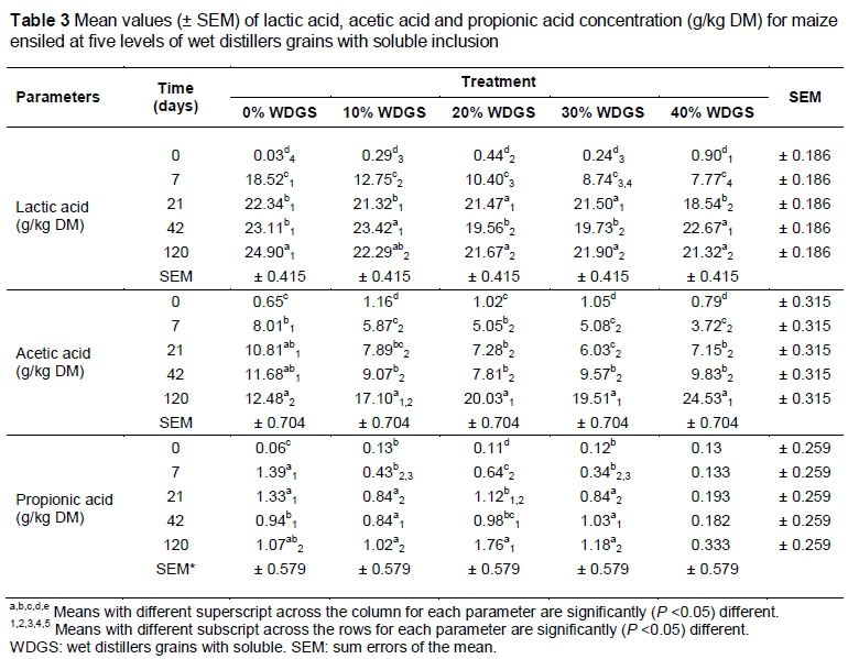 A low pH at time of ensiling inhibits homo-fermentative bacteria and allows for hetero-fermentative bacterial proliferation, which is responsible for acetic acid production during the early phases of ensiling (Garcia & Kalscheur, 2004). These authors reported that blending WDGS with other feeds resulted in fermentation patterns that differ from the traditional lactic acid fermentation patterns towards more acetic acid production. This is in agreement with the results reported for the present study in which acetic acid concentration was higher in maize silage treatments blended with WDGS compared with the control treatment at day 120 of ensiling. In the present study, the high concentration of crude protein indicated by the increased N content (Table 2) owing to the inclusion of WDGS could have resulted in higher concentrations of acetic acid production, as suggested by Kung & Shaver (2001).