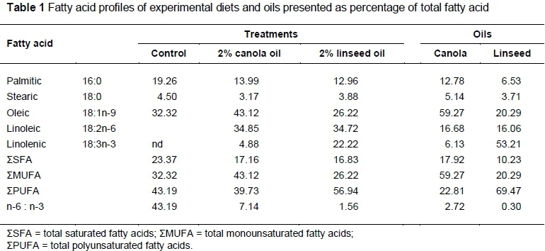 Treatments consisted of T1: control group; T2: 2% dietary canola oil; T3: 2% dietary linseed oil. The FA profiles of the dietary oils and diets were determined. The sample preparation for gas chromatography was according to the method presented by Alonso et al. (2004) and Genet (2004). The lipid profile was determined by gas chromatography (Shimadzu GC-2010 Plus, High-end Gas Chromatograph). Each FA was identified in the form of a methyl ester by comparing the retention times with the Supelco 37 Component FAME Mix standard acquired at Sigma Interlab A.S. (Interlab South Africa). The FA results are presented in Table 1.