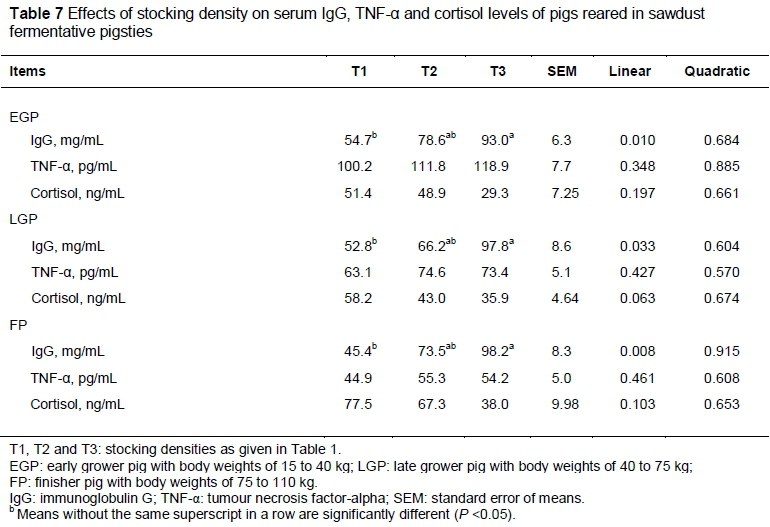 The effects of the space allowance on the serum IgG, TNF-α and cortisol levels in the growth stages are shown in Table 7. The serum IgG concentrations for all growth stages were significantly reduced with increased stocking density. The T1 group had the lowest value compared with the others (P <0.05 in the EGP and LGP and P <0.01 in the FP). Because the differences in T1 and T3 for serum IgG level were 58%, 53% and 45% in EGP, LGP and FP, respectively, the heavier pigs had a wider range of decrease than the lighter pigs. However, there were no effects of stocking density on the serum TNF-α in all the growth stages. The serum cortisol level did not differ in the EGP (P >0.05), although the authors observed an increase in the higher stocking density groups in LGP and FP (P = 0.063 in LGP; P = 0.103 in FP).