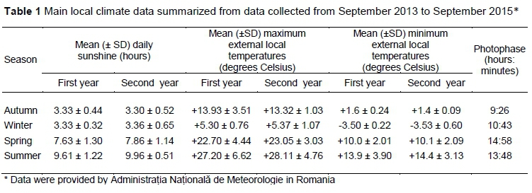 Research was conducted with a Yorkshire (Y) gilt population mated with Landrace boars. These Y gilts were moved in four groups from a pig farm in Denmark (55°48'N, 9°13'W) to a commercial pig farm in south Romania (44°03'N, 23°35'W), followed by a seven-week period of acclimatization. Ages varied from 16 weeks to 30 weeks at the moment of translocation. Local climate particularities in south Romania are presented in Table 1.