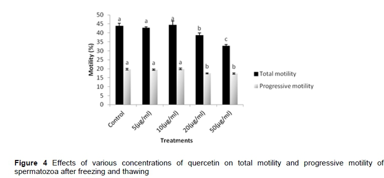 Total motility and progressive motility of frozen-thawed spermatozoa with the addition of 5 and 10 μg/mL of quercetin were not affected in comparison with 0 μg/mL, although they decreased significantly with 20 and 50 μg/mL of quercetin (Figure 4).