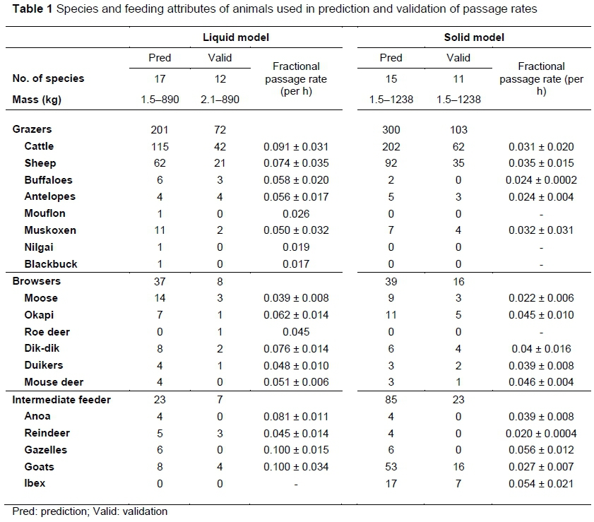 Data were collected from studies that reported at least average values or ranges for bodyweights of the animals, and measured fractional passage rates and/or mean retention times in the reticulo-rumen. A dataset was created that contained passage rates from wild and domesticated ruminants. Factors that affect passage rates were identified in each of these studies. Qualitative factors that affect passage rates were coded with numerical weightings. These were (factor = code/weighting): animal management (grazing = 1 or indoors = 0), feed class (silage = 1 or non-silage = 0), tannin content (feeds that were classified to be tannin rich were millet, sorghum, carob leaves, red clover and browse leaves = 1 and all other feeds with minute tannin levels = 0), and feeding regime (ad-íibitum = 1 or restricted = 0). Physiological status (day of pregnancy and lactation), animal production level, amount of urea in the diet (g/kg DM), animal body mass (kg), and mature body mass (kg) were also included.