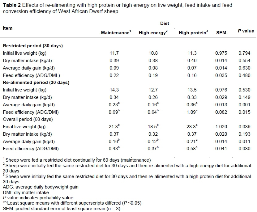Feeding sheep throughout the year is a major challenge to rural and urban sheep farmers and traders in sub-Saharan Africa. To ameliorate this challenge, sheep farmers and traders often keep their sheep on a maintenance diet during feed shortages and lower market demand for sheep (Ayantunde et al., 2008). However, as the Islamic festival of Ramadan and other religious festivals draw nearer, they re-aliment them with nutrient-dense supplementary feeds to catch up weight lost during feed scarcity, before selling them. Abegaz et al. (1996) reported that sheep that lost 10% of their weight during restricted feeding in the dry season were able to achieve the same weight as those that were offered supplementary feed throughout the season by growing at a faster rate during re-alimentation. In the present experiment, the improvements in ADG of sheep fed the HP compared with the other diets could be attributed to greater efficiency of weight gain per feed intake rather than to increased DMI because DMI did not differ among sheep during this period. This is consistent with data reported by Drouillard et al. (1991), Abouheif et al. (2015) and Keogh et al. (2015), who found that improvements during compensatory growth were attributed to greater efficiency of feed utilization during re-alimentation, but contradicts observations by Ryan et al. (1993b), who indicated that the phenomenon of compensatory growth in sheep and cattle was attributable to greater feed intake during re-alimentation.