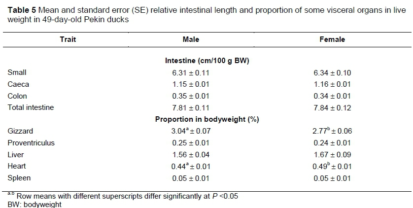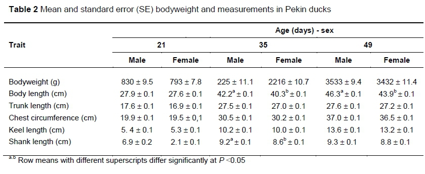 The average bodyweights and standard error were 58.6 + 0.1 g for males and 56.3 + 0.1 g for females and the weight increased with age (Table 2). The body measurements of the male and female hybrids increased up to 49 days old, which suggests that the males and females did not stop growing. Compared with females, males demonstrated significantly longer bodies (the trunk with the neck) and shanks at 35 days old, and again at 49 days. In terms of trunk length, keel length and chest circumference, non-significant differences were observed between males and females (Table 2).
