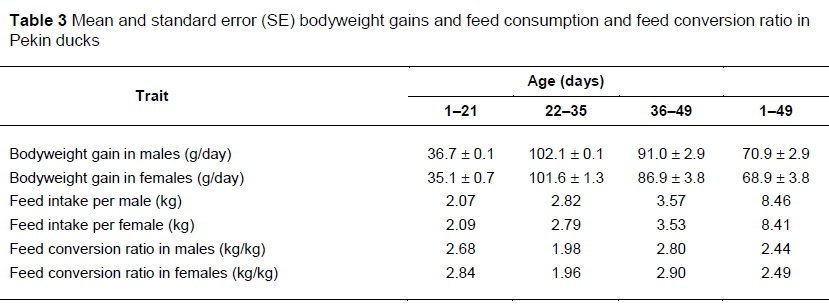 The daily weight gains were higher in males than in females (Table 3). The highest daily weight gains in males and females were noted between 22 and 35 days old, and the lowest until 21 days of growth. Compared with females, males consumed less feed to 21 days old. However, they showed a poorer feed conversion ratio (FCR) per kg of the weight gain over that period. Between 22 and 35 and between 36 and 49 days old and throughout the rearing period (1-49 days old) males consumed more feed than females. Males demonstrated poorer FCR than females between 22 and 35 days old and better FCR between 36 and 49 days and throughout the rearing period (Table 3).