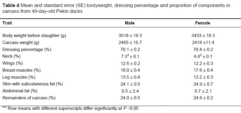 The percentage of eviscerated carcass with neck in the pre-slaughter weight of the ducks (dressing percentage) was higher in 49-day-old Star 53 HY ducks (69.3% in males, 65.3% in females) evaluated by Biesiada-Drzazga et al. (2011). Kokoszynski (2011) reported the dressing percentage of 49-day-old ducks as 69.8% in males and 72.7% in females. In turn, Witak (2008) found much lower dressing percentages in male (61.7%) and female (60.9) Pekin ducks aged 49 days, compared with the birds studied in the current experiment. Murawska et al. (2008) observed a higher dressing percentage in heavier ducks, which is associated mainly with a lower percentage of offal components (head, feet, inedible viscera) and giblets.