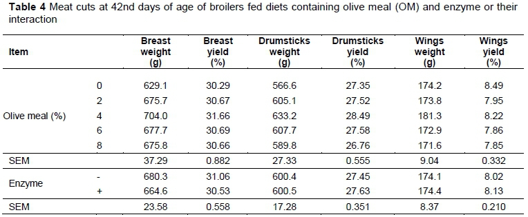 At day 42, the full and empty carcass weight, as well as the carcass yield, did not differ (P >0.05) in broilers fed diets with added OM or supplemental dietary enzymes (Table 3). These results are in agreement with those of Omar (2005), who found that adding up to 10% of olive pulp in broiler diet had no significant effect on carcass characteristics. The same author also reported that the level of olive pulp in diet had no influence on the weight of edible (i.e. liver, heart, gizzard) or inedible (i.e. oesophagus, crop, proventriculus) organs. Moreover, as reported in Table 4, the weight and yield of breast, drumsticks and wings were not different (P >0.05) when broilers were fed different levels of OM and enzyme or their combination.