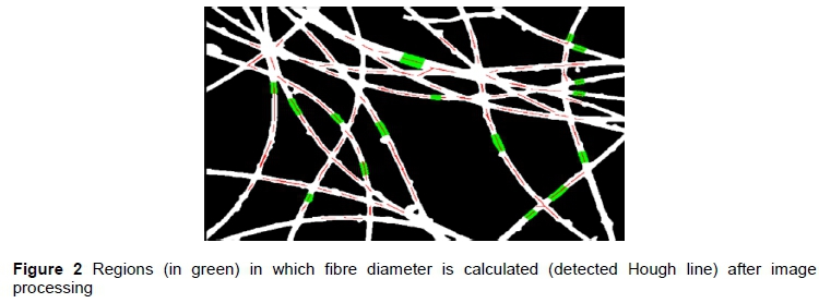 The images captured by a preconfigured digital camera with its SDK were improved (pre-processing enhancement) by converting to grayscale (to distinguish poorly lighted fibres), followed by segmentation and smoothing, then images were binarized to distinguish background shows (1 = displayed, 0 = bottom). Morphological erosion and dilation operations were performed to remove unwanted contaminants and residues, thus providing homogenized images of the fibres. The skeletonization of the fibre images, a process that involved removing a pattern (fibre images) of the greatest possible number of pixels without affecting its general form, was carried out to obtain a line (skeleton) of a single pixel. Then it was connected, evaluated and located in the center and along of each fibre image. To find outgoing branches of the skeleton Hough transform was used to find straights along the curvature of the fibre samples from these images. Then, edge detection algorithms were developed to define the distance of the fibre diameter in pixels.