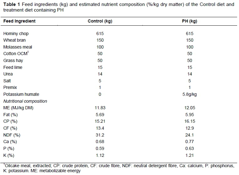 Information about the use of PH shows that it has growth-promoting effects in farm animals (Ragaa & Korany, 2016; Dehghani-Taftia & Jahaniana, 2016; Wang et al., 2008; Kocabagli et al., 2002). In addition, fulvic acids in humates have been shown to have beneficial effects on animal health by boosting the immune system as a result of their antipyretic, antiviral and detoxifying effects on toxic substances (Agazzi et al., 2007; Islam et al., 2005). Moreover, humates have been observed to reduce the volatile ammonia in animal waste (Islam et al., 2005). Islam et al. (2005) reported that humates can help relieve stress effects in calves entering feedlots for the first time. Although studies have been conducted on the use of PH as a growth promotant in animal feeding systems, many questions need to be answered. Most of these studies have focused on monogastric animals. There appears to be no conclusive information on the beneficial effects of PH on feedlot steers. Moreover, its effects on meat quality have not been elucidated. Therefore, the objective of this study was to establish the efficacy of PH as a growth promotant in feedlot diets, by assessing its effect on carcass characteristics and meat quality attributes of weaner calves in a feedlot.