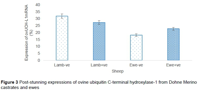 The post-slaughter expression of the marker (ovine UCH-L1 mRNA) from the animals showed its implication for detecting slaughter pain from meat species such as Dhone Merino sheep. The interactions between animals' age and sex contributed to varied expressions significantly (P <0.001) of pain signals from the lambs and ewes (Figure 3). This suggests that a single factor was not responsible for the expression of specifc target (ovUCH-L1 mRNA) from the slaughtered animals. Observation prior to slaughter indicated that each animal was restrained in an upright position to prevent flight or fight tendencies and to minimize wrong placement of electrodes during stunning. Regardless of the humaneness of the process, it is still practically difficult for animals to experience zero stress or pain-free slaughter procedures.