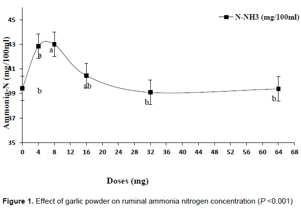 The results of the current study for NH3-N presented an increasing trend until 8 mg GaP and a decreasing trend at the dose of 16 and mainly 32 mg and 64 mg. This result is somewhat concordant with that of Kongmun et al. (2010), who showed that in a diet containing coconut, supplemented with various doses of garlic powder, NH3-N concentrations decreased mainly at 16 mg. However, Cardozo et al. (2005) affirmed that at 7.5 mg GaP, there was a decrease in the rate of NH3-N by about 25%. The increase in NH3-N that was noted in the current experiment at doses of 4 and 8 mg could be explained by the stimulation of proteolytic activity in the rumen.