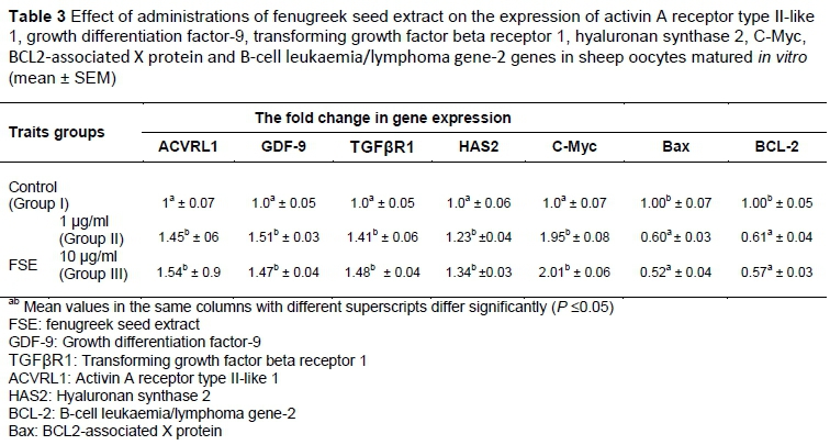 Any improvements in assisted reproduction techniques at experimental level are important in in vitro production of large animal and human embryos. The in vitro embryo production system includes three major steps, namely in vitro maturation of the primary oocytes, in vitro fertilization of the matured oocytes, and in vitro culture of presumptive embryos. The success of in vitro fertilization and embryo culture depends on the success of in vitro maturation. Fenugreek seed extract (FSE) is an important source of steroid hormones, antioxidants, and anti-inflammatories. This study aims to investigate the effect of FSE on the maturation progression, glutathione (GSH) concentration, and expression of certain genes controlling maturation such as growth differentiation factor-9 (GDF-9), transforming growth factor beta receptor 1 (TGFβR1), activin A receptor type II-like 1 (ACVRL1), hyaluronan synthase 2 (HAS2), C-Myc, B-cell leukaemia/lymphoma gene-2 (BCL-2), and BCL2-associated X protein (Bax) of matured sheep oocytes. To carry out this study, cumulus-oocyte complexes (COCs) aspirated from sheep ovaries were cultured in TCM-199 medium supplemented with various concentrations of FSE (0, 1 and 10 µg/mL). The results indicated that the mean values of matured oocytes were 65.2 compared with 47.8 in the control group. Concerning the candidate genes, expression was improved in oocytes matured with FSE when compared with oocytes cultured without extract. In conclusion, the addition of FSE to the maturation medium at 1 or 10 µg/mL concentrations improved the maturation of oocytes.