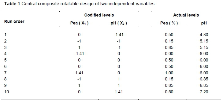 The study was designed as a central composite rotatable design. This study was carried out in two replications. A quadratic model was used to determine the combined effect of pea and pH. A total of 10 combinations including centre points (two replicates) were designed in random order. Encoded and actual levels are given in Table 1.