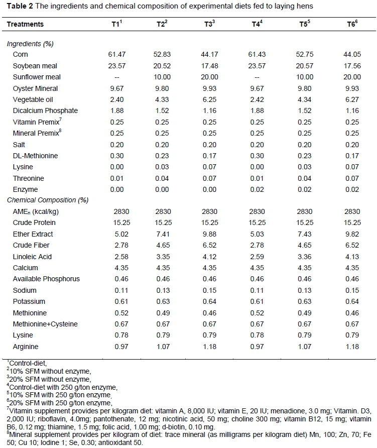 Therefore, the objective of this study was to investigate the effects of different SFM levels and a multiple enzyme complex on productive performance, biochemical parameters, and antioxidant status of laying hens.