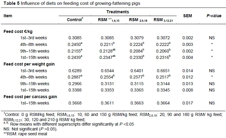 Economic analysis was conducted according to Choi et al. (2015) to assess the effect of feed cost on weight gain of pigs. The feed cost per weight gain was calculated based on the current price of raw materials (April 2018). In each phase, the cost index was based on feed cost per weight gain, comparing experimental diets with graded levels of RSM with the control diet.
