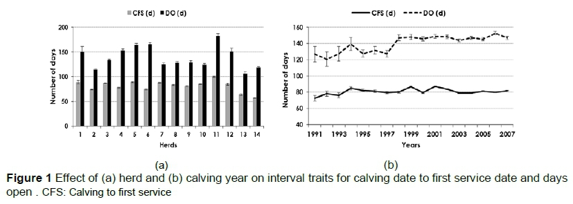 The effect of herd and calving year on the interval traits CFS and DO is presented in Figure 1 (Muller et al., 2014). Large differences were found between herds. That is, minimum and maximum intervals were 75 and 142 days for CFS and 115 and 185 days for DO, respectively