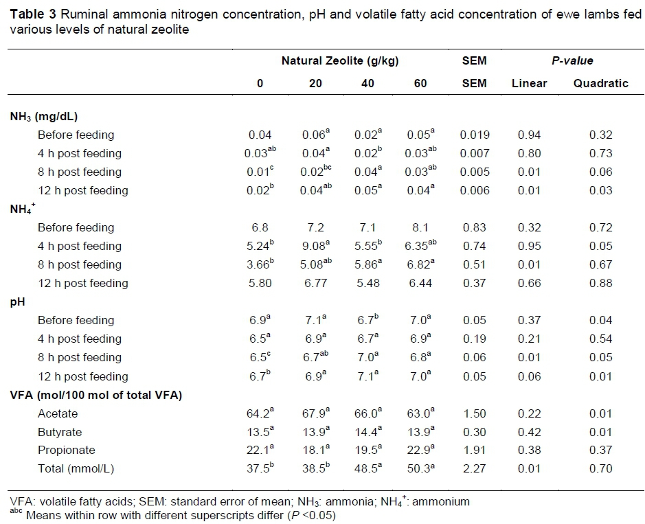 All ruminal pH values in the present study were in the normal range of 6.5 to 7, where most of the ammonia would be present in the form of NH4+, as reported by Abdoun et al. (2007). Higher ruminal pH values as a result of zeolite treatment could be due to high ruminal NH3 as a result of rapid urea hydrolysis in the rumen. The rise in ruminal pH as a result of the increase in ruminal NH3-N was also demonstrated by Pan et al. (2003). However, this was in contrast with Kardaya et al. (2012), who found that the addition of zeolite decreased ruminal pH, which indicated that zeolite was able to capture NH3 through its cation exchange capacity.
