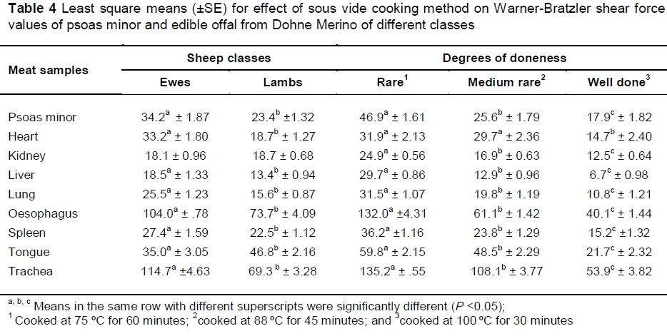 Sous vide processing had a significant effect on the tenderness of only four (of the nine) samples of the non-intestinal offal (Table 2). The tenderness of the psoas minor muscle, kidney, liver, lung and oesophagus followed a similar pattern because there were no differences (P >0.05) among samples from the lambs, six-tooth and eight-tooth sheep. The results showed that the tenderness of the heart, trachea, tongue and spleen was significantly (P <0.05) influenced by age group. In comparison with the younger sheep, higher WBSF values (P <0.05) recorded from the trachea, tongue and spleen showed that the muscle of eight-tooth sheep was tougher. As expected, the presence of tough cartilaginous rings in the trachea of the ewes contributed significantly (P <0.05) to the highest WBSF values, meaning that the trachea was tougher than other meat samples. The WBSF values for sheep at 10 - 12 months and 23 - 36 months old were statistically similar. It can thus be deduced that more mechanical force was expended on the non-intestinal samples, which had comparatively higher WBSF values, to cut through their fibres and cartilage during shearing. A general observation on the cooking regimens showed that most of the non-intestinal offal responded in a similar way to intestinal samples under the rare, medium rare and well-done degrees of doneness.