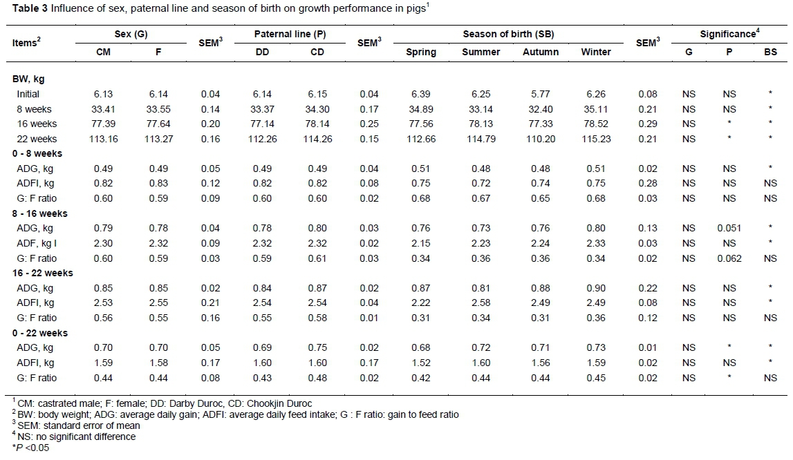 Traditionally, the pig breeds producing the pork consumed in Republic of Korea were (Landrace χ Yorkshire) χ Duroc crosses. Duroc was used because the paternal line has outstanding meat quality, and the Republic of Korea therefore imported Duroc semen. Yet sometimes there was an imbalance in supply and demand for farmers. Through genetic selection for 10 years, the Rural Development Administration of the Republic of Korea developed a new paternal line (Chookjin Duroc) which is a cross between the Duroc and a Korean native pig, in order to adjust the balance of supply and demand and improve growth performance and meat quality of pigs. From 75 to 116 kg BW, barrows had higher average daily feed intakes (ADFI) and average daily gains (ADG) than gilts, and higher ADFIs than gilts from 116 to 124 kg (Latorre et al., 2004). Carcasses produced by the barrows were heavier than those of the gilts, even though other studies reported that carcass weight and yield were not affected by sex (Latorre et al., 2003; 2004). Backfat thickness was affected, with intact females having a lower backfat thickness than males (Peinado et al., 2008). However, no basic investigations have been done on the new paternal line, nor comparative studies with the existing paternal line. Additionally, few studies have been conducted to find out how season influences growth performance and carcass traits and how the paternal line influences growth performance and carcass traits in pigs. As social income levels have improved, preference for better meat quality is increasing, and participants in the pig industry have focused on feeds and feed additives to improve the growth performance and meat quality of pigs. Therefore, the present study was designed to evaluate the influence of season of birth, sex and paternal line on growth performance and carcass traits of pigs.