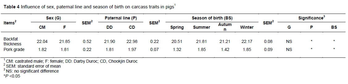 Heat stress can reduce carcass traits directly. In the current results, pigs born in spring had lower (P <0.05) backfat thickness and pork grades than those born during other seasons except for autumn. This is in agreement with the findings of Spencer et al. (2005) and White et al. (2008), who found that carcass fat quality decreased when heat stress occurred.